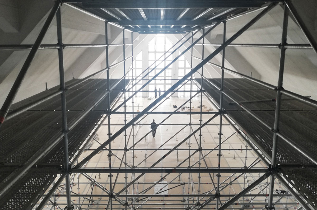 Die in bauzeitlicher Substanz erhaltene Halle in Eisenbetonbauweise wurde nach intensiven Bestandsuntersuchungen in enger Zusammenarbeit mit dem Denkmalschutz so saniert, dass sämtliche bauzeitlichen Oberflächen und Materialien in ihrer handwerklichen Qualität sichtbar erhalten bleiben. Dazu wurden umfangreiche Baubehelfe in Form von Wetterschutzdach außen und Raumgerüst innen über dem Verkaufsraum erstellt. Durch den Einsatz von aus einer Brückensanierung wiederverwendeten Holz-Brettschichtträgern und Holzbohlen konnte der Verkaufsraum nahezu stützenfrei überspannt werden und ein staubdichter Abschluss zu den darüber stattfindenden Betoninstandsetzungsarbeiten geschaffen werden, ohne den Handel mit offenen Lebensmitteln zu beeinträchtigen. Sowohl Brettschichtträger als auch Holzbohlen sind bereits zur Wiederverwendung als Tragwerk für das neue Verwaltungsdach vorgesehen und müssen nicht entsorgt werden. Sämtliche Überprüfungen zur Tragfähigkeit und Abbund der Holzträger können vor Ort ohne weitere Transportwege durchgeführt werden.